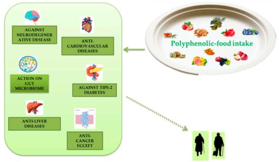 Polyphenols are widespread constituents of vegetables, fruits, olive oil, chocolate, legumes, and beverages such as tea, wine, and coffee. The consumption of polyphenolic-food symbolizes a promising therapeutic approach to avert many chronic syndromes and ameliorate health. Main polyphenolic-foods comprise fruits (such as apples, peaches, pomegranates, plums, apricots, sweet cherries, etc.), berries (such as black elderberry, black chokeberry, plum, low bush blueberry, raspberry, blackcurrant, cherry, strawberry, blackberry, black grapes, prune, etc.), vegetables (such as globe artichokes, green chicory, red chicory, broccoli, red onion, spinach, curly endive, etc.), nuts (such as hazelnuts, chestnuts, walnuts, pecans, almonds, etc.), fruit juices (such as lemon juice, blood orange juice, etc.), soy (such as tofu, soy tempeh, soybean sprouts, soy yogurt, soy flour, etc.), green and black tea, red wine, cereals, coffee, and chocolate [,].