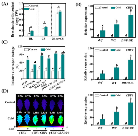 Cold-induced brassinosteroid (BR) regulated cold tolerance via c-repeat binding factor (CBF)-dependent pathway in tomato. (A) Cold-induced brassinosteroid accumulation. Brassinosteroid contents in tomato leaves after exposure to 25 °C (Control) and 8 °C (Cold) for 8 h. BL, brassinolide; CS, castasterone; 28-norCS, 28-norcastasterone. * indicates significant differences according to T-test at 0.05% level.(B) The relative expression levels of CBF genes in dwf mutant, wild-type (WT), and DWARF-overexpressing transgenic plants (DWF:OE) after exposure to 25 °C (Control) or 8 °C (Cold) for 8 h. (C) The relative electrolyte leakage (REL) and (D) the maximum quantum efficiency of photosystem II (Fv/Fm) in the control (pTRV), CBF1-silenced (pTRV-CBF1), and CBF1/2/3-co-silenced (pTRV-CBF1/2/3) plants with and without exogenous BR. For cold treatment, plants were exposed to 8 °C for 24 h and subsequently exposed to 4 °C for another six days. For the exogenous BR treatment, the plants were foliar applied with 200 nM EBR 24 h before cold treatment. Plants sprayed with distilled water were used as the control. Data are the means of three biological replicates (±SD) (A–C) or eight replicates (D). Different letters indicate significant differences according to Tukey’s test at 0.05% level.