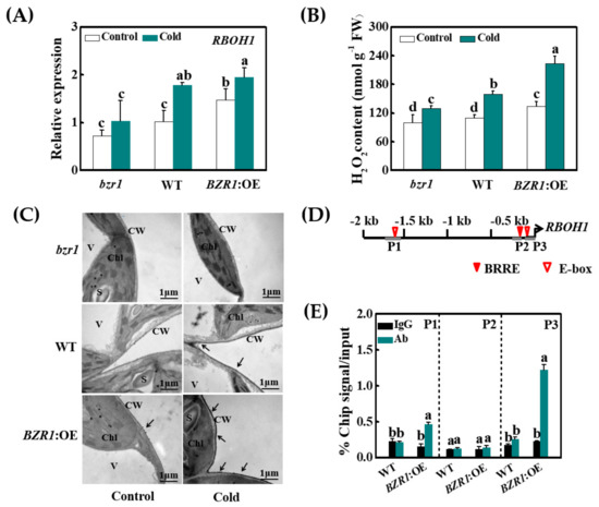 3.5. Cold- and BR-Induced Apoplastic H2O2 Accumulation Is Dependent on the Transcriptional Activation of RBOH1 by BZR1