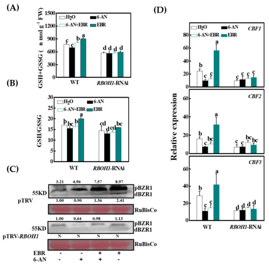 To determine whether RBOH1-mediated BZR1 accumulation is regulated by redox homeostasis, we analyzed the effects of glutathione redox homeostasis on BR-induced cold tolerance and BZR1 abundance, using 6-aminonicotinamide (6-AN, an inhibitor of the pentose phosphate pathway, which produces NADPH [40]). EBR treatment induced increases in the accumulation of total glutathione and in GSH/GSSG ratios under cold conditions, while a pretreatment of 6-AN abolished the EBR-induced increases in both parameters in the WT plants (Figure 5A,B). EBR- and 6-AN-induced changes in glutathione homeostasis were largely attributable to changes in GSH levels rather than GSSG (Figure S8). Neither EBR nor 6-AN altered the accumulation of total glutathione or the GSH/GSSG ratios in the RBOH1-silenced plants (Figure 5A,B). These different responses in glutathione homeostasis to EBR and 6-AN were associated with different responses of BZR1 accumulation in the WT and RBOH1-silenced plants. As shown in Figure 5C, pretreatment with 6-AN decreased the accumulation of the BZR1 protein in response to EBR under cold conditions in the WT plants, but these treatments had limited effects in the RBOH1-silenced plants. The 6-AN treatment attenuated the cold-dependent increase in CBF1, CBF2, and CBF3 transcripts in the absence or presence of the EBR treatment in the WT plants. This treatment did not alter the levels of CBF1, CBF2, and CBF3 transcripts in the RBOH1-silenced plants (Figure 5D). Similarly, EBR-induced cold tolerance was abolished by the 6-AN pretreatment in the WT plants, as indicated by the changes in REL and the Fv/Fm ratios. However, both EBR and 6-AN had little effect on REL or the Fv/Fm ratios in the RBOH1-silenced plants (Figure S9).
