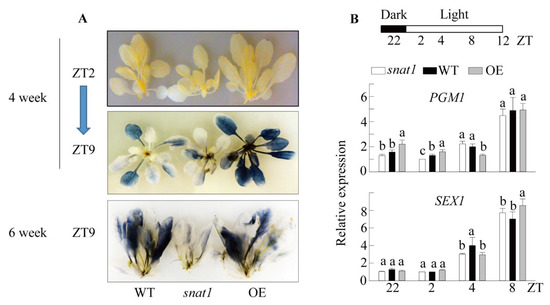 (A) Comparison of leaf starch contents. WT (Col-0), snat1, and SNAT1 OE Arabidopsis lines grown under 50 μmol m−2 s−1 light conditions for four or six weeks were decolorized and stained with iodine solution, washed with water, and photographed. Plants were collected at Zeitgeber time (ZT)2 or ZT9. (B) qRT-PCR analysis showing induced expression of starch metabolism-related genes in WT (Col-0), snat1, and OE Arabidopsis plants. Leaf samples were collected at various ZT intervals. The target transcript levels were normalized to those of the EF1α endogenous control. ZT, Zeitgeber time; ZT0 represents dawn. Values are means ± standard deviation of three independent experiments. Different letters indicate significant differences (Tukey’s post hoc HSD test; p < 0.05).