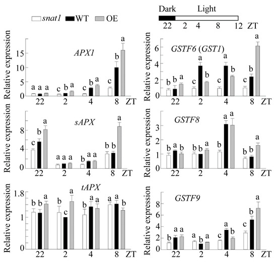 Temporal qRT-PCR analysis of various Arabidopsis genes involved in the reactive oxygen species (ROS) defense and scavenging systems at various ZT intervals. Total RNA was isolated, and transcript levels in WT, snat1, and OE Arabidopsis lines were measured by qRT-PCR. The relative fold expression values are normalized to EF1α expression. Error bars show the standard deviation of three biological replicates. Different letters indicate significant differences (Tukey’s post hoc HSD test; p < 0.05).