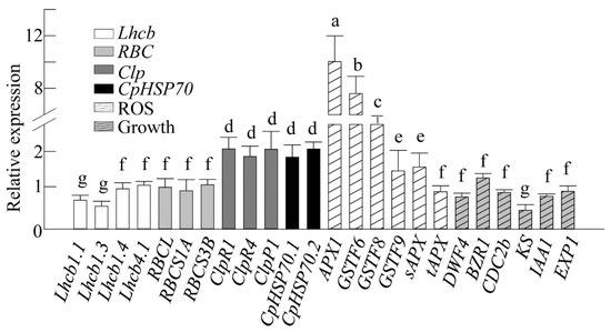 Total RNA was extracted from Arabidopsis plants using a Nucleospin RNA Plant Kit (Macherey-Nagel, Duren, Germany). Reverse transcription was performed using a Stratagene Reverse Transcription Kit (Stratagene, La Jolla, CA, USA) with 500 ng of oligo (dT)18 or random octamer primer for RBCL and ClpP1 (CancerROP, Seoul, Korea). The PCR reaction was conducted as following conditions initial denaturation 95 °C (3 min), denaturation 95 °C (30 s), annealing 56 °C (30 s), and extension 72 °C (1 min) with 30 µL of master mix. qRT-PCR was performed on a Mic qPCR Cycler System (Bio Molecular Systems, Queensland, Australia) using SYBR Green RT-PCR Reagent Kit (Luna Universal qPCR Master Mix; NEB, Hitchin, UK) in accordance with the manufacturer’s protocol. The primer sequences for RNA analysis are shown in Table S1. EF-1α (EF1ALPHA; At5g60390) was used for signal normalization. The data were analyzed by analysis of variance using IBM SPSS Statistics 25 software (IBM Corp. Armonk, NY, USA). Means with different letters or asterisks indicate significantly different values at p < 0.05 according to a post hoc Tukey’s honestly significant difference (HSD) test. All data are presented as mean ± standard deviation.