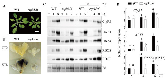 (A) Rosette phenotype of WT (Col-0) and mpk3/6-double knockdown plants. Plants were grown for four weeks under a light intensity of 50 μmol m−2 s−1. (B) Leaf starch contents of the WT (Col-0) and mpk3/6 lines. Plants were collected at ZT2 or ZT8. (C) Western blot analysis using anti-ClpR1, -Lhcb1, -Lhcb4, -RBCS, and -RBCL antibodies, as described in Figure 3. Plants were collected at ZT6 or ZT8. (D) Diurnal expression of ClpR1, APX1, and GST1 at ZT2, ZT4, and ZT6. Scale bar: 1 cm. Different letters indicate significant differences (Tukey’s post hoc HSD test; p < 0.05).