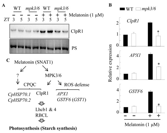 Melatonin-mediated defense responses against pathogens and endoplasmic reticulum (ER) stress require MAPK signaling [9,36]. ROS-mediated retrograde signaling also depends on MAPK signaling [45,49]. We used an MPK3/MPK6-double knockdown Arabidopsis line (mpk3/6) to confirm whether the MAPK pathway is involved in the CPQC and ROS defense systems [36]. The mpk3/6 exhibited a dwarfism phenotype and a defect in starch accumulation at ZT8, comparable with that in snat1 (Figure 7A,B). Both the ClpR1 and Lhcb1 protein levels were significantly downregulated in mpk3/6, whereas the Lhcb4 and RBCS protein levels were similar to those in the WT. In contrast, the RBCL level was higher in mpk3/6 than in the WT. The different protein expression patterns in snat1 and mpk3/6 indicate that MPK3/6 does not function exclusively in melatonin signaling. Meanwhile, the expression of ClpR1, APX1, and GSTF6 (GST1) transcripts was lower in mpk3/6 than in the WT, suggesting defects in chloroplast chaperone activity and the ROS defense system in mpk3/6 (Figure 7D). Finally, to ascertain whether melatonin-induced ClpR1 was dependent on the MAPK signaling pathway, the leaves of WT and mpk3/6 were challenged with melatonin, and the levels of ClpR1 protein and related transcripts were measured. As shown in Figure 8, ClpR1 was induced in response to 1 μM melatonin treatment in the WT but was significantly inhibited in the mpk3/6 mutant. Moreover, induction of the ClpR1 transcript together with APX1 and GST1 was suppressed in mpk3/6, compared with the WT. These data suggest that melatonin is involved in the induction of ClpR1 via the MAPK signaling cascade, followed by enhanced and stable expression of Lhcb1 protein and related transcripts such as APX1, and GSTF6, which are important regulators of growth and photosynthesis in Arabidopsis (Figure 8C).