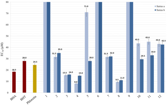 Overall, for both series, the most effective molecules were substituted by catechol groups, and their EC50 values were highly competitive with the currently used references and phloretin. These results may be confirmed in vivo.