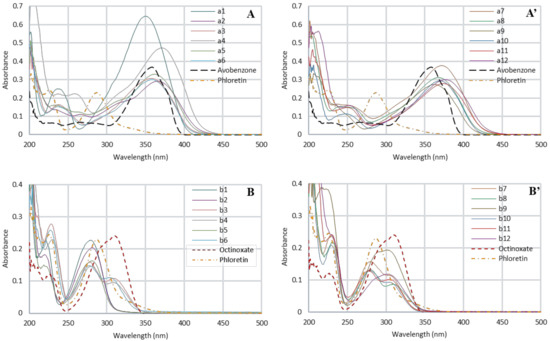 Regarding the DHCs (i.e., phloretin and the twelve analogs), the presence of the two bands was also observed, although as expected, the absence of the double bond resulted in a hypsochromic shift of the band I at around 250–350 nm covering a part of UV-B like with octinoxate (dotted red line, Figure 3B,B’). DHCs absorbances were lower than those of CHs. However, phloretin showed a maximal absorbance (0.23), competitive with octinoxate (0.24), as did compound b1 (0.23). Finally, b2 and b9 also revealed significant absorbances (0.21 and 0.19, respectively), while the other DHCs were not efficient enough. It may be noted that some compounds presented two absorption maxima for the band I (b3, b4, b6, b7, b8, and b11).