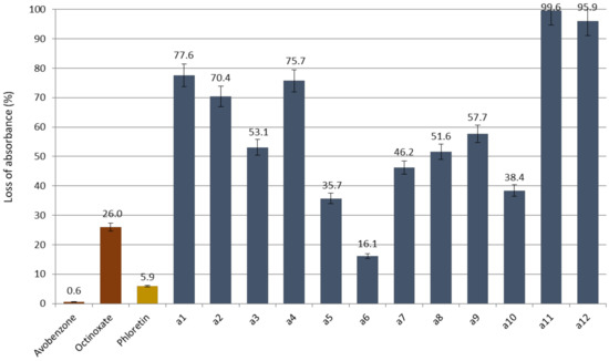 Regarding the synthesized CHs, promising compounds in terms of absorption intensity, a1, a4 and a7 showed excessively high absorbance losses of 77.6%, 75.7% and 46.2%, respectively. Only a6 displayed a loss of absorbance of 16.1% that could compete with UV-A filters.