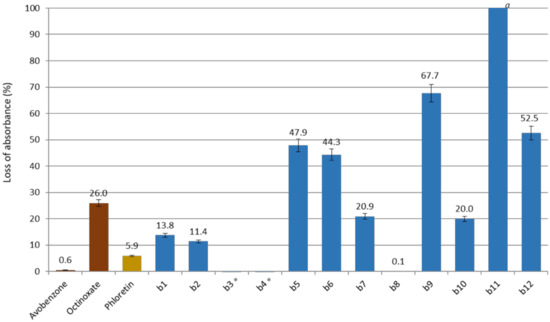 Loss of absorbance (in %) for dihydrochalcones series, phloretin and references avobenzone and octinoxate. a Full loss of absorbance. * Negative loss of absorbance (after 1 h of irradiation the absorbance was higher than at t0).