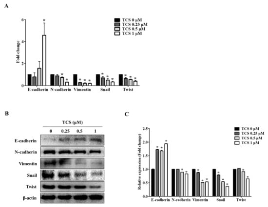 3.5. TCS Inhibits Expression of Epithelial–Mesenchymal Transition (EMT) Markers in CT26 Cells