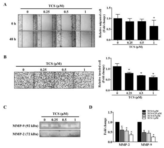 3.6. TCS Inhibited Migration and Invasion of CT26 Cells