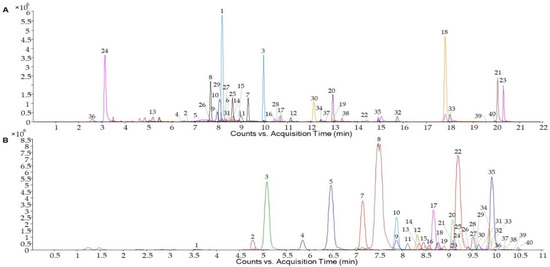 Phenolic profile of wine lees hydrolysate. Extracted ion chromatograms (EIC) of non-anthocyanin (A) and anthocyanin (B) phenolic compounds analyzed by UHPLC-(ESI-)-Q-TOF-MS and UHPLC-(ESI+)-Q-TOF-MS, respectively. Identified individual compounds are numbered according to Table 2 and Table 3.