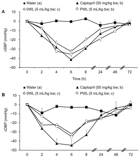 Water and Captopril (50 mg/kg bw) were used as negative and positive controls, respectively. Prior to oral treatment administration, animals presented SBP and DBP values characteristic of the hypertensive condition (205.6 ± 3.6 mmHg and 164.7 ± 10.0 mmHg, respectively). As shown in Figure 4, the administration of water to animals did not significantly change either SBP or DBP during the experiment. However, Captopril produced a decrease in SBP in SHR after 2 h of its administration, its maximum being at 6 h post-administration (−41.3 ± 3.2 mm Hg) (Figure 4A). The same pattern of SBP drop occurred after administration of 0 WL. A maximum SBP reduction of −32.5 ± 2.3 mmHg was observed at 6 h post-administration. Regarding the effect of the PWL, the maximum SBP decrease was observed at 4–6 h post-administration (−32.3 ± 1.5 and −35.6 ± mmHg, respectively). Notably, the BP lowering effect of PWL was greater than the antihypertensive effect shown by 0 WL. Interestingly, no significant differences were found between the antihypertensive effect of Captopril and PWL (two-way ANOVA). In addition, the duration of the effect was different. The antihypertensive effect produced by PWL was more prolonged than the one showed by 0 WL or Captopril. Basal SBP levels were recovered at 24, 48, and 72 h post-administration for 0 WL, Captopril and PWL, respectively.