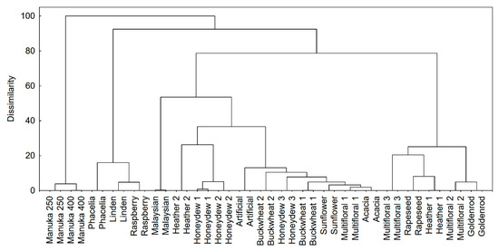 Some bioactive polyphenolic compounds (phenolic acids and flavonoids) were detected in honey samples (Table 2 and Table 3). If samples were compared according to the variation of polyphenolic compounds (Figure 2), five groups became distinguishable (cutting the dendrogram at 40%). The samples from the 1st group contained a high concentration of polyphenols but these were much lower than those found in manuka honeys (2nd group), which mainly resulted from the content of caffeic acid (Table 2). The samples from the 3rd and 4th groups had similar concentrations of polyphenols but their profiles were totally different. The 5th group was very wide and also included the control sample, although polyphenols were not detected in artificial honey.