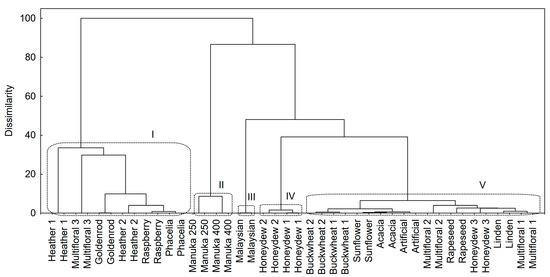 Cluster analysis results—the data set with 18 polyphenolic compounds was included as a bioactive fingerprint of a sample; Ward’s method was used as an amalgamation rule and squared Euclidean distances were used as a distance measure. I–V, cluster numbers.