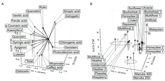 The PCA was computed for honey samples according to their polyphenolic profiles to see relation between variables and samples. The three PCs explained 68% of the total variance (Figure 3). The five groups were circled (Figure 3B) analogously to the cluster analysis results presented above. The samples from the 1st group (heather, phacelia, goldenrod) contain most of the detected polyphenols. The position of manuka samples (2nd group) was determined by their high concentration of caffeic acid, datiscetin and rhamnetin. Sinapic acid and astragalin dominated in the samples from Malaysia (3rd). Genistein was detected only in samples from the 4th group (honeydew), and these samples had relatively high concentrations of protocatechuic acid. The 5th group contained a lot of honey samples, of which the location was determined by chlorogenic acid.