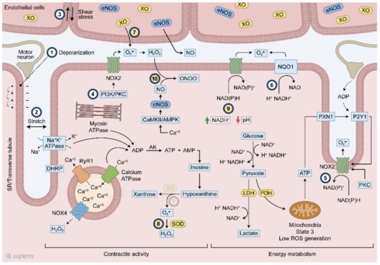 Overview of the mechanisms of reactive oxygen species (ROS) generation following exercise. Multiple mechanisms related to ROS generation in skeletal muscle during contraction. #1 membrane depolarization, #2 stretch #3 shear stress, #4 PI3K/PKC, #5 ATP/P2Y1, #6 NQO1 #7 XO, #8 SOD, #9 NADH/pH and #10 CaMK/AMPK. Numbers from 1 to 6 (#1–6) indicate signaling pathways already established. Numbers from 7 to 10 (#7–10) show hypothetical pathways. #7-The presence of XO in skeletal muscle is still a debated topic.