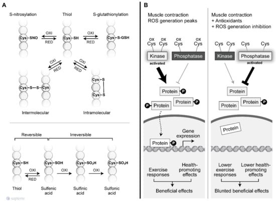 Redox-mediated signaling mainly occurs via the targeted modifications of specific residues in proteins [55]. Thus, the complex redox code behind the activation of specific exercise responses is not likely a “switch on/off” mechanism, but instead, redox modification is thought to occur, which affects the enzyme activity. The redox-based post-translational regulation of protein function occurs principally through modification of Cys thiol side chains within proteins. Sulfhydryl groups on cysteines are the preferred targets for oxidation or for the formation of disulfide bonds. The sulfhydryl (–SH) group may initially be reversibly oxidized to sulfenic acid (SOH), which is further oxidized to a sulfinic acid (SO2H) or irreversibly oxidized to sulfonic acid (SO3H). The hydroxyl radical can irreversibly oxidize protein sulfhydryl groups leading to protein damage (Figure 2A) [42,56].