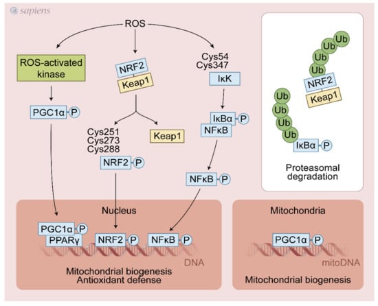 Exercise-generated ROS activate redox-sensitive transcription factors. ROS lead to various post-translational modifications that increase upstream pathways that promote PGC-1α activation (e.g., P38 MAPK, CaMK, AMPK). NRF2/Keap1 complex dissociation is stimulated by ROS, avoiding its proteasomal degradation thereby sustaining the NRF2 signaling. Additionally, ROS can directly activate NRF2 through cysteines modifications. NF-kB cysteines oxidation activates IkK that phosphorylates IkBα, leading to its dissociation and activation of NF-kB signaling. These redox-sensitive transcription factors regulate mitochondrial biogenesis and antioxidant defense in response to physical exercise.