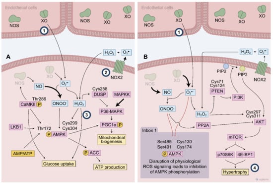 Exercise-generated ROS affect redox sensitive protein activated following endurance (A) and resistance exercise (B). During endurance exercise, the ROS mediated signaling activates multiple cascades such as P38 MAPK and AMPK to promote the exercise responses. ROS modify specific cysteines leading to AMPK phosphorylation at Thr172. AMPK activation is described to promote many exercise responses, such as glucose uptake and mitochondrial biogenesis. Dual-specificity phosphatase (DUSP) cysteine modifications is a possible target of ROS to control P38 MAPK signaling during exercise. High intensity exercise recruits many different ROS sources that contribute to this ROS mediated signaling. ROS participates of PI3K activation through both a direct mechanism involving AKT activation and an indirect mechanism by attenuation phosphatase activities (e.g., PP2A and PTEN), then favouring the hypertrophy signaling. Inbox: Thr 172 AMPK phosphorylation is blunted by disrupted ROS signaling where either an excessive or blunted ROS production alters the expected AMPK activation following exercise. (#1–4 indicates knowledge gaps. #1 indicates the debated topic about XO location. #2 the main source of ROS in contracting muscle. #3 the need to uncover the mechanisms by which exercise stimulates glucose uptake and #4 the involvement of PI3/Akt as a redox sensitive cascade to promote hypertrophy).