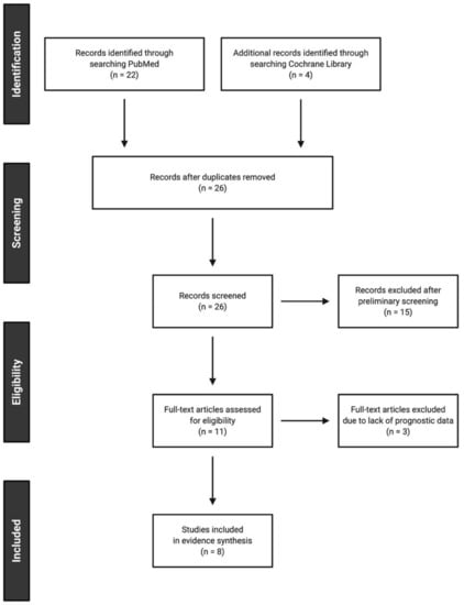 Thus far, only a few studies have investigated the prognostic role of serum GGT in patients with urologic neoplasms, including RCC, PC, and UC. A systematic search of articles written in English was done on 31 December 2020 using PubMed and the Cochrane Library using the search terms, (gamma-glutamyltrans* AND (prognos* OR survival) AND (“renal cell carcinoma” OR “prostate cancer” OR “urothelial carcinoma” OR “transitional cell carcinoma”)). Two independent investigators (K.T. and F.K.) conducted the search and selection of articles. Potential discrepancies were resolved by open discussion. In total, 26 articles were extracted, from which eight relevant articles published between August 2014 and November 2020 were identified in accordance with the preferred reporting items for systematic reviews and meta-analyses statement [97]. Details of the search and article selection are summarized in the flow diagram (Figure 3). A PICO framework (i.e., participants, intervention, comparator, and outcomes) was applied to the screening as well as the interpretation process in the systematic review [98]. In brief, clinical studies were considered eligible if they fulfilled the following criteria: