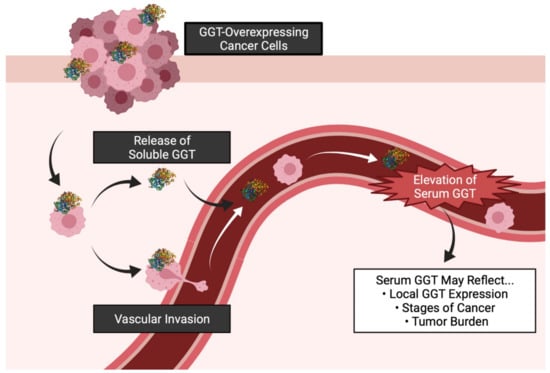 Elevated serum GGT was more predictive of the prognosis of advanced diseases [8,10,11,12,13,14] than of early stage diseases [7]. It may therefore be hypothesized that the heavy tumor burden is required for GGT overexpression by cancer cells to become detectable in the serum of patients (Figure 4).