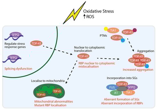 RBP nuclear to cytoplasmic mislocalisation and aggregation is considered a key hallmark of disease, evident across both fALS and sALS cases [,,,,,,]. Mutations in RBPs can also cause their mislocalisation to the cytoplasm [,,]. Multiple, possibly overlapping, pathomechanisms have been identified in ALS. In addition to RBP dysfunction, increased oxidative stress, mitochondrial dysfunction, impaired nucleocytoplasmic transport, protein dyshomeostasis, deficits in axonal transport, excitotoxicity and non cell autonomous mechanisms of disease arising from glia are thought to contribute to motor neuron death in ALS. Here, we review the dysfunction of RBPs and their interplay with oxidative stress and mitochondrial dysfunction in ALS, as well as highlight potential therapeutic strategies targeting these pathways.