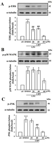 Effects of CBN on ERK1/2, p38MAPK, and JNK1/2 phosphorylation in LPS-induced RAW cells. Cells were treated with 0.1% DMSO or CBN (20–40 μM) for 20 min, and then induced by LPS (1 μg/mL) for 30 min. The (A) ERK, (B) p38MAPK, and (C) JNK phosphorylation was detected by immunoblotting. Data are expressed as the means ± S.E.M. (n = 4). *** p < 0.001, LPS vs. control cells; ## p < 0.01, LPS vs. treatment groups.