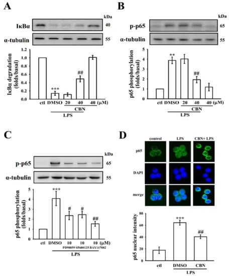 Effects of CBN on LPS-induced NF-κB signaling pathway in RAW cells. RAW cells were treated with CBN (20 and 40 μM) for 20 min with or without LPS (1 μg/mL) for 30 min. Immunoblotting assay was performed to detect (A) IκBα degradation and (B) p65 phosphorylation. (C) Effect of the BAY117082, PD98059, or SP600125 on p65 phosphorylation in LPS-induced RAW cells. (D) CBN reversed LPS-induced NF-κB p65 nuclear translocation. Data were graphed by pooling multiple images, with each individual data point corresponding to the mean fluorescence intensity of each individual cell nucleus. ** p < 0.01 and *** p < 0.001, LPS vs. control cells; # p < 0.05, and ## p < 0.01, LPS vs. CBN-treated cells (n = 4).
