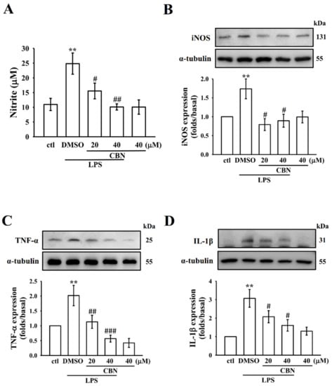 Elevated levels of NO are considered to be an index for inflammatory disorders and a suitable target to find potent anti-inflammatory agents []. The increased production of NO can be attributed to the overexpression of iNOS, which is an important inflammatory mechanism. The NO production and iNOS protein expression were effectively augmented in LPS-induced RAW 264.7 cells (Figure 4A,B), however, co-treatment with CBN significantly reduced the extent of augmentation. This result suggests that the inhibition of NO production by CBN may be connected with its suppressive effect on LPS-induced iNOS protein.