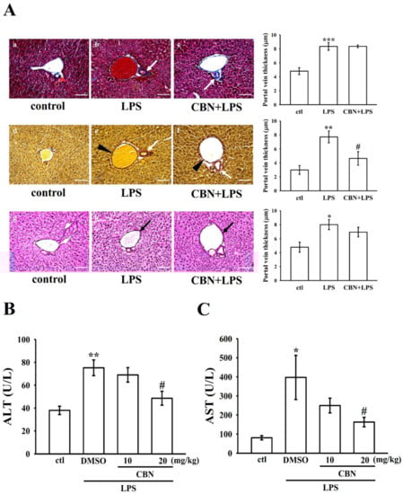 CBN dampens the LPS-induced hepatic injury in mice. (A) Effect of CBN on the histological alterations in liver tissue. Trichrome stain (a–c). The white arrow indicates the collagen deposition in the portal triad region of liver tissues. More abundant collagen fibers surrounded by arteriole and bile duct in LPS- and CBN + LPS-treated groups as compared to the control group. Weigert’s resorcin fuchsin stain (d–f). Collagen fibers (red fibers indicated by white arrows) and elastic fibers (dark blue fibers indicated by black arrowheads) in control, LPS, and CBN + LPS groups. Reticulum stain (g–i). A network of fine black reticular fibers identified between the sinusoids and the plates of hepatocytes (indicated by black arrow) in the control, LPS, and CBN + LPS groups. The thickness of the portal vein was calculated using MShot Image Analysis System. Bar = 100 μm. (B,C) CBN reduces LPS-induced serum alanine aminotransferase (ALT) and aspartate aminotransferase (AST) activities. Illustrative views of control, LPS, CBN (20 mg/kg) + LPS groups are presented (magnification 20x). Data presented are the means ± S.E.M. (n = 6); * p < 0.05, ** p < 0.01, and *** p < 0.001, LPS vs. control group; # p < 0.05, LPS vs. CBN group. The statistical power range was from 0.8–0.9.