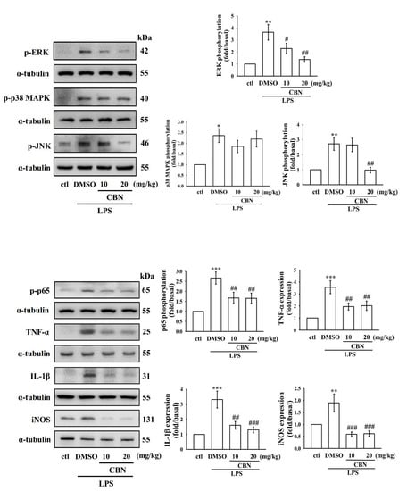Effects of CBN on the expression of MAPK/NF-κB p65, TNF-α, and IL-1β and iNOS in LPS-induced liver tissue. Mice were treated with CBN (10 and 20 mg/kg) for 2 h and then induced by LPS (1 μg/mL) for 6 h. The expression of phosphorylated ERK, p38, JNK, and p65 and the protein expression of TNF-α, IL-1β, and iNOS were evaluated as described in the Materials and Methods. Data presented are the means ± S.E.M. (n = 6); * p < 0.05, ** p < 0.01, and *** p < 0.001, LPS vs. control group; # p < 0.05, ## p < 0.01, and ### p < 0.001, LPS vs. CBN group. The statistical power range was from 0.8–0.9.
