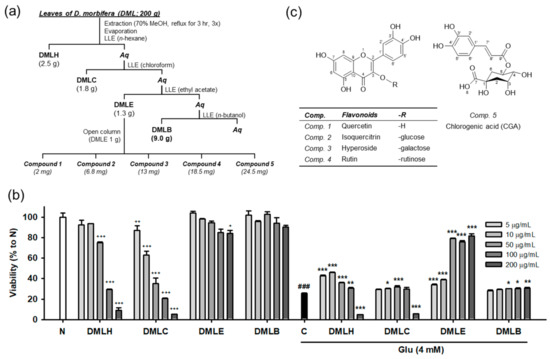 Isolation and structure of compounds from the Dendropanax morbifera leaves. (a) Scheme of fractionation and isolation; (b) Cytotoxicity and protective effect of DML extracts on Glu-induced HT22 cell death; (c) Structure of isolated compounds; Student’s t-test (N vs. C, ### p < 0.001); One-way ANOVA (N vs. drugs, + p < 0.05, ++ p < 0.01, +++ p < 0.001; C vs. Glu + drugs, * p < 0.05, ** p < 0.01, *** p < 0.001); DMLH, hexane extract; DMLC, chloroform extract; DMLE, ethyl acetate extract; DMLB, n-butanol extract; Aq, aqueous fraction; LLE, liquid–liquid extraction; Glu, glutamate; N, non-treated normal cells; C, control cells treated with Glu alone.
