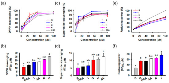 Antioxidant activities of isolated compounds. (a,b) 2,2-Diphenyl-1-picrylhydrazyl (DPPH) radical scavenging activities and half maximal inhibitory concentration (IC50); (c,d) Superoxide radical scavenging activities and IC50; (e,f) Reducing power activities and half maximal effective concentration (EC50); Different lowercase letters above bars indicate significant differences among the groups (One-way ANOVA, p < 0.05); AA, ascorbic acid; CGA, chlorogenic acid; H, hyperoside; I, isoquercitrin; Q, quercetin; R, rutin.
