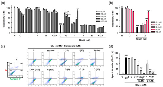 Effect of isolated compounds on the Glu-induced apoptotic cell death in HT22 cells. (a,b) Cytotoxicity and protective effect of isolated compounds on Glu-induced loss of cell viability. HT22 cells were treated with compound and/or Glu for 24 h. Cell viability was measured using MTT assay; (c,d) Effect of isolated compounds on Glu-induced apoptosis. HT22 cells were treated with compounds and/or Glu for 8 h. Apoptosis was measured using PI/Annexin V staining and flow cytometric analysis. Apoptotic cells (%) represents the sum of Annexin V-positive/PI-negative (Q2) and Annexin V-positive/PI-positive cell population (Q3); Student’s t-test (N vs. C, ### p < 0.001); One-way ANOVA (N vs. drugs, + p < 0.05, +++ p < 0.001; C vs. Glu + drugs, * p < 0.05, ** p < 0.01, *** p < 0.001); CGA, chlorogenic acid; H, hyperoside; I, isoquercitrin; Q, quercetin; R, rutin; Glu, glutamate; N, non-treated normal cell; C, control cells treated with Glu only; MTT, 3-(4,5-dimethylthiazol-2-yl)-2,5-diphenyl tetrazolium bromide; PI, propidium iodide.