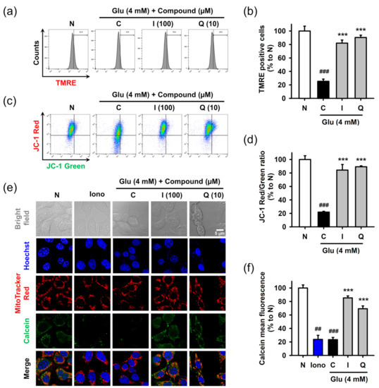 Effect of isoquercitrin and quercetin on the Glu-induced mitochondrial dysfunction in HT22 cells. (a,b) Mitochondrial membrane potential measured using TMRE staining and flow cytometric analysis; (c,d) Mitochondrial membrane potential measured using JC-1 staining and flow cytometric analysis; (e,f) Mitochondrial membrane permeabilization measured using Hoechst/MitoTracker Red/calcein AM/Co2+ staining and confocal microscopic analysis; After HT22 cells were incubated with compound or Glu for 8 h, cells were stained and analyzed; Student’s t-test (N vs. C, ## p < 0.01, ### p < 0.001); One-way ANOVA (C vs. Glu + drugs, *** p < 0.001); I, isoquercitrin; Q, quercetin; Glu, glutamate; N, non-treated normal cell; C, control cells treated with Glu only; Iono, ionomycin; JC-1, 5,5′,6,6′-tetrachloro-1,1′3,3′-tetraethylbenzamidazol-carboncyanine; TMRE, tetramethyl rhodamine ethyl ester.