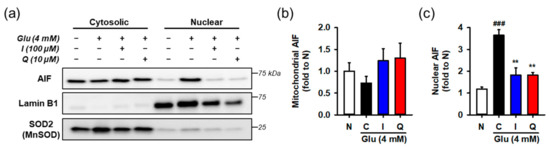 Effect of isoquercitrin and quercetin on the Glu-induced nuclear translocation of AIF. (a) Representative blot images; (b,c) Quantitative data of mitochondrial and nuclear levels of AIF; After incubation with compounds or Glu for 12 h, HT22 cells were fractionated into cytosolic and nuclear fraction. Lysates of each fraction were analyzed using Western blotting; Student’s t-test (N vs. C, ### p < 0.001); One-way ANOVA (C vs. Glu + drugs, ** p < 0.01); AIF, apoptosis-inducing factor; I, isoquercitrin; Q, quercetin; Glu, glutamate; N, non-treated normal cell; C, control cells treated with Glu only.