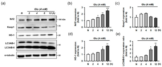 Before testing the effect of the compounds, we examined whether Glu modulates the Nrf2 and autophagy pathways as an adaptive response to oxidative stress. For time-course experiments, HT22 cells were treated with 4 mM Glu for 0–12 h. Protein levels of Keap1, Nrf2, HO-1, LC3AB, and α-tubulin were measured using Western blotting (Figure 7). The activation of autophagy was assessed by the conversion of LC3AB-I to LC3AB-II (LC3AB-II/-I ratio). Glu increased the levels of Nrf2, HO-1, and ratio of LC3AB-II/-I in a time-dependent manner, but the Keap1 level was slightly increased at early times from 2 to 4 h and reduced to normal levels after 8 h. Considering the significant autophagy activation after 8 h of Glu treatment, autophagy may partly contribute to the maintenance of even levels of cytosolic Keap1 as the clearance and recycling machinery. As a result of rapid proteasomal degradation, Nrf2 has a relatively short half-life of 20 min compared to Keap1 at 12 h [11]. The trend of Nrf2 and HO-1 expression following Glu challenge was exactly the same, implying that the excess cytoplasmic Nrf2 was readily translocated to the nucleus and increased HO-1 expression. These data suggest that Glu significantly activates Nrf2 signaling and autophagy after 8 h.