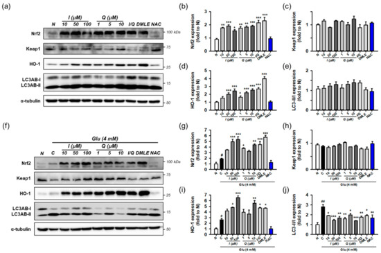 Effect of isoquercitrin and quercetin on the Nrf2/HO-1 and autophagy pathways. (a) Representative blot images showing the effect of compounds without Glu treatment; (b–e) Quantitative data of protein levels of Nrf2, Keap1, HO-1, and ratio of LC3AB-II/-I in blot (a); (f) Representative blot images showing the effect of compounds with Glu treatment; (g–j) Quantitative data of protein levels of Nrf2, Keap1, HO-1, and ratio of LC3AB-II/-I in blot (f); After HT22 cells were incubated with compound or Glu for 8 h, cell lysates were analyzed using Western blotting; Student’s t-test (N vs. C, # p < 0.05, ### p < 0.001); One-way ANOVA (C vs. Glu + drugs, * p < 0.05, ** p < 0.01, *** p < 0.001); Glu, glutamate; N, non-treated normal cell; C, control cells treated with Glu only; I, isoquercitrin; Q, quercetin; I/Q, combination of 50 μM of I and 7.0 μM of Q; DMLE, 100 μg/mL of ethyl acetate-soluble extracts of Dendropanax morbifera leaves; NAC, 1 mM of N-acetyl-L-cysteine.