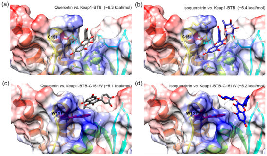 To investigate the interactions of isolated compounds with the active site in the BTB domain of Keap1 (Keap1-BTB), we performed a molecular docking simulation. The binding free energies of isoquercitrin or quercetin for Keap1-BTB binding were −6.4 and −6.3 kcal/mol, respectively (Figure 9), which were lower (i.e., more stable) than that of other compounds (hyperoside, −5.7 kcal/mol; rutin, −6.1 kcal/mol; chlorogenic acid, −6.1 kcal/mol; Figure S14). In our docking model, quercetin was located in the binding pocket of Keap1-BTB with the same orientation as the previously reported docking model (Figure 9a) [50]. The hydroxyl at the C-7 position of quercetin was located inside the binding pocket, and the hydroxyl groups at C-3′ and C-4′ were facing outward. The relative orientation of isoquercitrin was almost identical to that of quercetin; therefore, glucose attached at C-3 was located on the opposite side of the binding pocket (Figure 9b). Oxygen at the 1-position (O-1) of both quercetin and isoquercitrin was the closest atom to cysteine residue (C151) in Keap1, and the distances between the two were 3.3 Å for quercetin and 3.5 Å for isoquercitrin. Furthermore, our docking models indicated that the hydroxyl groups at C-7 of quercetin and isoquercitrin are closely associated with the positively charged residues in the binding pocket of Keap1-BTB (blue regions in Figure 9a,b), thus stabilizing the binding of quercetin and isoquercitrin to Keap1. The importance of C151 for ligand binding was also revealed by the docking of quercetin and isoquercitrin to the mutant BTB domain at C151W of Keap1 (Keap1-BTB-C151W; Figure 9c,d). Due to steric hindrance by the bulky side chain of the tryptophan residue (W151), the structure of the binding pocket was modified to restrict the access of ligands. The relative orientations of the compounds were completely different from those of Keap1-BTB, and compounds could not fit into the binding pocket. Isoquercitrin and quercetin docked in mutant Keap1-BTB showed completely different conformation with higher binding free energies (−5.2 kcal/mol for isoquercitrin and −5.1 kcal/mol for quercetin), suggesting weak and unstable binding. Therefore, the effect of isoquercitrin and quercetin on Nrf2 activation may be mediated by their interaction with Keap1.