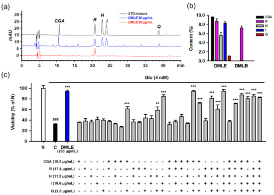 Determination of isolated compounds in the extracts of Dendropanax morbifera leaves and identification of active ingredients representing the protective effects of extracts using the combinatory treatment. (a) HPLC-UV chromatograms of standard mixture (5 μg/mL for CGA, R, H, and I; 0.5 μg/mL for Q) and solvent extracts of DML (50 μg/mL for DMLE; 20 μg/mL for DMLB); (b) Contents (%, w/w) of isolated compounds in solvent extracts of DML. Bar represents mean ± standard deviation; (c) Protective effects of isolated compounds on the Glu-induced HT22 cell death using the combinatory treatment strategy. HT22 cells were treated with Glu and/or diverse combinations of compounds for 24 h. Indicated concentrations of compounds were equivalent to their contents in 200 μg/mL of DMLE. Cell viability was measured using MTT assay; Student’s t-test (N vs. C, ### p < 0.001); One-way ANOVA (C vs. Glu + drugs, ** p < 0.01, *** p < 0.001); DML, Dendropanax morbifera leaves; DMLE, ethyl acetate-soluble extracts of DML; DMLB, n-butanol soluble extracts of DML; CGA, chlorogenic acid; H, hyperoside; I, isoquercitrin; Q, quercetin; R, rutin; Glu, glutamate; N, non-treated normal cell; C, control cells treated with Glu only.
