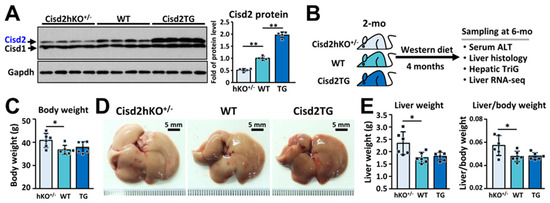 A Western diet (WD), which contains 40% energy from fat, 43% energy from carbohydrate, and 0.15% cholesterol (w/w), has been developed that mimics the equivalent human Western diet [29]. To test whether the genetic dosage of Cisd2 modulates the severity of pathogenesis of WD-induced fatty liver, mice having different copy numbers of Cisd2 in their livers and thus expressing different levels of Cisd2 protein (Figure 1A), namely Cisd2hKO+/− (50%), WT (100%), and Cisd2TG (200%), were fed the WD for 4 months. The mice were fed the WD starting at 2-month-old and were analyzed at 6-month-old (Figure 1B). Notably, Cisd2hKO+/− mice showed a greater gain in body weight compared with the WT and Cisd2TG mice; however, there is no significant difference between the WT and Cisd2TG mice (Figure 1C). Interestingly, the morphology of the livers obtained from the WD-treated Cisd2hKO+/− mice were lighter in color and looked bigger in size; indeed, in the Cisd2hKO+/− mice, there was a significant increase in the weights of the livers, as well as an increase in the ratio of liver weight to body weight (Figure 1D,E).