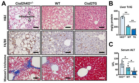 In terms of pathology, when the WT mice were examined, WD feeding was found to induce overt fat accumulation in the liver, as evidenced by H&E staining of liver sections (Figure 2A). Strikingly, in the WD-fed Cisd2hKO+/− mice, there was a significant increase in fat accumulation and this was accompanied by inflammation, both being able to be observed in the H&E stained liver sections. Furthermore, IHC staining of F4/80 was used to validate the presence of inflammation and to locate the macrophages that had accumulated around the lipid droplets within the livers of the WD-fed Cisd2hKO+/− mice. In addition, severe liver fibrosis was also detectable in the WD-fed Cisd2hKO+/− mice, as indicated by Masson’s trichrome staining (Figure 2A). Remarkably, in the WD-fed Cisd2TG mice after 4 months, the two-fold overexpression of Cisd2 could be seen to have obviously brought about a decrease in lipid droplet deposition, while at the same time there had been a discernible attenuation of liver inflammation and reduced liver fibrosis (Figure 2A). Consistent with these pathological findings, a significant increase in the levels of hepatic triglyceride (TriG) and serum alanine aminotransferase (ALT), the latter being a liver damage marker, was found in the WD-fed Cisd2hKO+/− mice compared with the WD-fed WT mice. By way of contrast, among the WD-fed Cisd2TG mice, the levels of hepatic TriG and serum ALT were significantly lower compared with the WD-fed WT controls (Figure 2B,C). Taken together, these findings reveal that the dosage of Cisd2 modulates the level of severity of WD-induced NAFLD. Cisd2 haploinsufficiency, namely a half dose of Cisd2, is insufficient, and this state accelerates WD-induced liver pathogenesis in the liver and exacerbates its progression toward NASH. Conversely, an enhanced level of Cisd2 is able to attenuate WD-induced NAFLD thereby preventing the development of NASH at a later stage.
