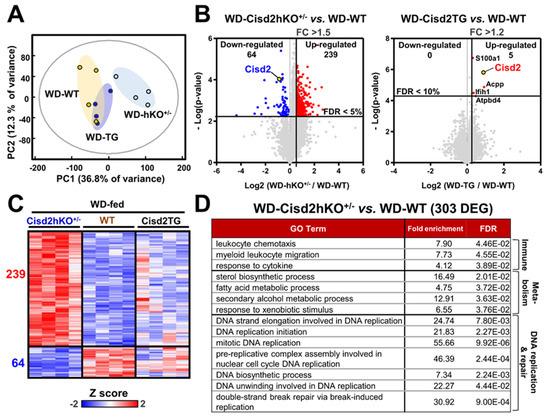 Cisd2 modulates hepatic gene expression profiles in WD-treated mice. (A) Principal component analysis (PCA) of all transcriptomic data for the 3 groups of mice (WD-fed WT, WD-fed Cisd2hKO+/−, and WD-fed Cisd2TG mice). (B) Volcano plots comparing mRNA expression between Cisd2hKO+/− vs. WT (left panel) and between Cisd2TG vs. WT (right panel). (C) Heatmap representing the Cisd2hKO+/−-induced 303 DEGs. (D) Over-represented PANTHER GO-Slim Biological Processes of transcriptome change (303 DEGs). Top GO terms with fold enrichment above 4 are shown.