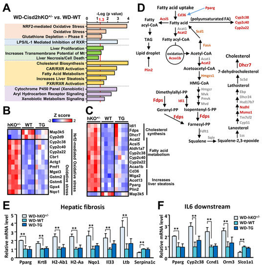Using IPA software, Nrf2-mediated oxidative stress, LPS/IL-1-mediated pathway, cholesterol biosynthesis, and fatty acid metabolism were found to be among the top functional processes and/or pathways annotated by IPA (Figure 4A). Interestingly, the most significant observation is that the changes in mRNA expression affected by Cisd2 haploinsufficiency are ones that involve the induction of genes involved in Nrf2-mediated oxidative stress, as well as those involved in cholesterol biosynthesis and fatty acid metabolism (Figure 4B,C). In the liver, cholesterol can be derived from either the animal’s diet or by de novo synthesis via the mevalonate pathway. Notably, two critical enzymes in the latter pathway were found to be induced in WD-fed Cisd2hKO+/− mice, namely farnesyl diphosphate synthase (Fdps) and 7-dehydrocholesterol reductase (Dhcr7). An overview of the interconnection between fatty acid metabolism and the cholesterol synthesis pathway is presented in Figure 4D. Moreover, in the WD-fed Cisd2hKO+/− mice, despite the fact that the “hepatic fibrosis” pathway and the “IL-6-mediated” pathway are not selected as within the top list annotated by IPA, a certain number of genes involved in these two pathways are also significantly induced in the WD-fed Cisd2hKO+/− mouse livers compared with those of the WT mice. In the “hepatic fibrosis” pathway, eight fibrogenic genes (Pparg, Krt8, H2-Ab1, H2-Aa, Nqo1, Il33, and Ltb) are upregulated, and one gene (Serpina1c) is downregulated (Figure 4E). In the “IL-6-mediated” pathway, four IL-6 downstream genes (Pparg, Cyp2c38, Ccnd1, and Orm3) are upregulated, and one gene (Slco1a1) is downregulated (Figure 4F). These findings are consistent with the pathological findings (Figure 2A), namely that severe inflammation occurs in the livers of WD-treated Cisd2hKO+/− mice together with fibrosis.