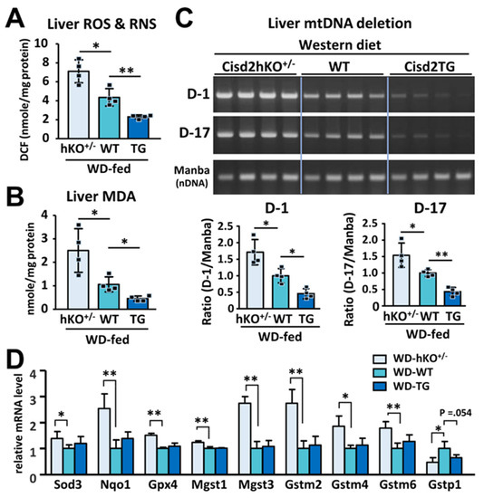 An inverse correlation between Cisd2 level and WD-induced oxidative stress in the liver. (A) Total reactive species levels (ROS/RNS) in the liver tissues of WD-fed mice (n = 4). (B) Hepatic contents of malondialdehyde (MDA) (n = 4). (C) Deletions of mitochondrial genome (mtDNA) in the liver tissues of WD-fed mice. Manba is a control nuclear gene (n = 4). (D) Differentially expressed genes involved in antioxidant defense in the liver tissues of WD-fed mice. The mean value of WT control group was set as 1 (n = 4). Data are presented as mean ± SD. * p < 0.05; ** p < 0.005.