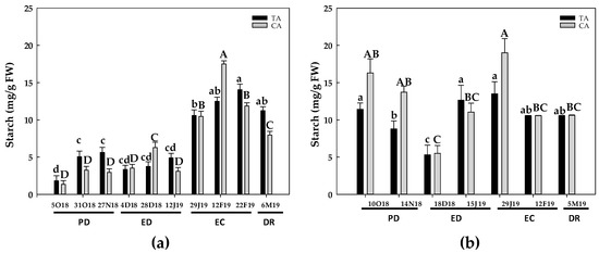 In the season 2017–2018, in the TA, starch contents increased about 3 times at the end of PD, remaining constant until the end of ED. Then, starch contents strongly increased at EC, showing a peak at the end of EC (Figure 2a). Finally, starch contents slightly decreased at DR, although the levels remained about 6-times higher than the initial values (Figure 2a). In the CA, the behavior was somewhat similar, the starch contents showing a 5-fold increase at ED and peaking at EC, with a near 13-fold the initial values. Finally, starch content decreased at the end of EC and at DR, its levels at this point being, however, near 6-fold the initial values (Figure 2a).