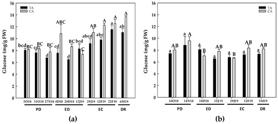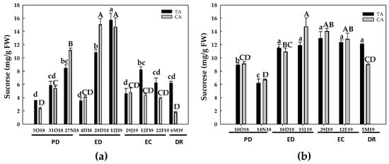 The sucrose contents in the first season (Figure 3) increased at PD in both locations, especially in the cold area (5 and 2.3 times in the CA and TA, respectively), followed by a decrease at the beginning of ED in both regions, reaching the initial values. Then, sucrose contents peaked at the end of ED in both regions. Finally, sucrose declined at EC and DR, mainly in the CA (Figure 3a). In the second season, sucrose decreased at PD, the decline being statistically significant only in the TA (30% decrease). Again, sucrose levels peaked at ED in both cases, especially in the CA (60% increase vs. 30% increase in the TA). Finally, sucrose remained constant until DR in the TA, but decreased in the CA in relation to the values found at EC (Figure 3b).