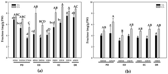 During the first season, the levels of fructose in peach buds from the TA declined about 50% at the end of PD. Then, the fructose levels remained constant at ED, followed by consecutive increases at EC and DR took, reaching the initial values. In the CA, fructose increased from the end of PD to the beginning of ED, followed by a 40% decrease at the end of ED, and finally increased at EC and DR (Figure 5a). In contrast, during the second season, fructose levels remained unchanged in the TA. In the CA, fructose levels also remained statistically unalterable except for a slight decrease recorded from the end of PD to the beginning of ED (Figure 5b).