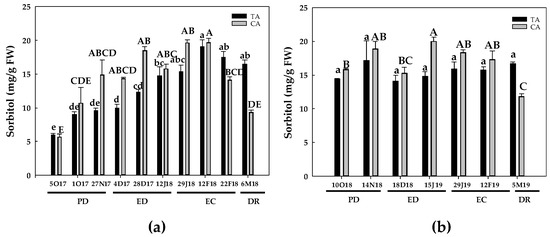 Regarding sorbitol, its contents remained statistically unchanged at PD in the TA during the first season, but a 60–70% increase was produced at ED. Then, sorbitol peaked at EC and remained unchanged until DR, although sorbitol levels were 2.8-fold higher in relation to its initial values (Figure 6a). In the CA, sorbitol increased during PD, reaching a 2.6-fold increase with respect to the initial values. The values remained constant at ED and at the onset of EC. Then, sorbitol concentration declined during EC and DR until the initial values were reached (Figure 6a). During the second season, no changes in sorbitol levels were noticed in the TA. In the CA, sorbitol remained constant at PD and at the onset of EC. Then, sorbitol showed a 27% increase at the end of ED and remained statistically unchanged until EC. Finally, a 25% decrease at DR in relation to the initial values was observed (Figure 6b).